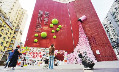 游客在老通城·通城印巷艺术墙前打卡。