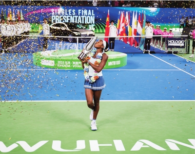10月12日,冠军高芙在颁奖仪式上亲吻奖杯。当日,在2025年WTA武汉网球公开赛女子单打决赛中,美国选手高芙2比0战胜美国选手佩古拉,夺得冠军。