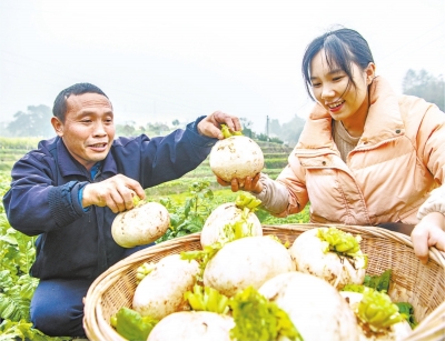 在重庆市綦江区赶水镇石房村赶水萝卜种植园内,种植户在田地里收获萝卜。
