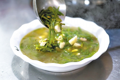 云南省大理白族自治州洱源县右所镇西湖村村民制作的海菜芋头汤。(资料图片)