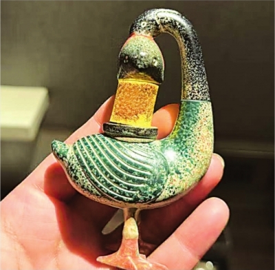 彩绘雁鱼铜灯冰箱贴灵感来源于馆藏汉代文物彩绘雁鱼铜灯,雁颈修长,双足并立,作鸿雁回首衔鱼伫立状,雁背设计了灯盘,带柄可转动,便于调节灯光方向。灯罩为两片弧形板,可左右开合。而冰箱贴不仅完美还原雁鱼铜灯的古典风貌,还设计了亮灯,让2000年前的“黑科技神灯”闪闪发光。