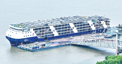 10月13日,装载汽车的运输船准备从湖北省武汉市江威智能汽车有限公司码头起航(无人机照片)。