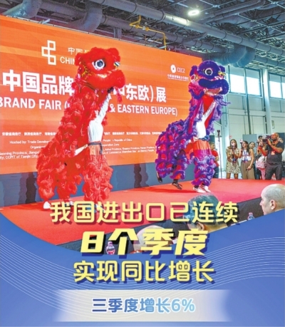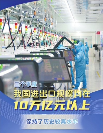 从出口端看,我国出口有效应对多方面压力和挑战,保持良好增长态势,前三季度出口19.95万亿元,同比增速达到7.1%,连续8个季度保持增长;从进口端看,尽管同期进口13.66万亿元,同比下降0.2%,弱于出口,但降幅相比前8个月收窄1个百分点,表明随着提振消费专项行动持续发力,国内需求正在改善。