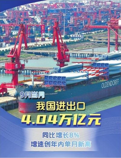 从季度看,增速逐季加快。从一、二季度分别增长1.3%、4.5%,到三季度增长6%,我国进出口已连续8个季度实现同比增长。与此同时,三个季度进出口规模均在10万亿元以上,保持了历史较高水平。从月度看,9月当月进出口4.04万亿元,同比增长8%,增速创年内单月新高,出口、进口则连续4个月同比双增长。