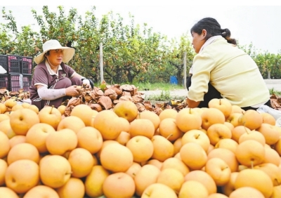 在蚌埠市五河县城关镇沟东村的一处梨园,果农在分拣梨子。(资料照片)