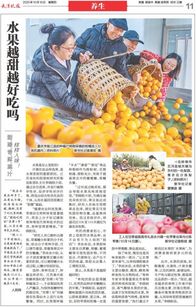 “单纯的甜会显得腻口,优秀的品种讲究糖酸比的平衡。”李晓刚说,适度的酸味能提升风味的层次感,让甜味更清新、更立体。例如,好的苹果和柑橘一定是甜中带微酸,梨也是如此。