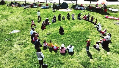 2025年春假期间,湖北恩施州利川市第三民族实验小学组织学生和家长一起放风筝。