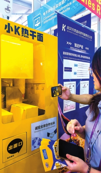 “太神奇了!”来自德国的采购商马克在品尝机器人制作的热干面后,竖起大拇指,立即掏出手机录制制作全过程。