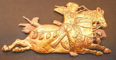 大多数展品为首次公开亮相。一件骑射武士形饰牌,独享展柜,饰牌上的武士造型独具动感:骑者缠头巾,双目圆瞪,嘴下有浓密的络腮胡须,双手拉弓欲射。赵婧介绍,这件饰牌风格可追溯到由波斯人建立的西亚萨珊王朝,“饰牌上的造型与西亚金银器上的帝王狩猎图像类似,然而骑士装束却为吐蕃风格,反映了当时波斯艺术发展至巅峰并传播至中国、西欧、非洲、印度等地区”。