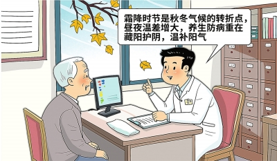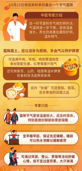 10月23日将迎来秋季的最后一个节气霜降。中医专家介绍,这一时节是秋冬气候的转折点,气温将进一步下降,昼夜温差增大,养生防病重在藏阳护阴,温补阳气。