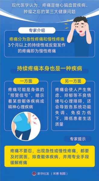 “持续疼痛本身也是一种疾病。”中日友好医院疼痛科主任樊碧发介绍,疼痛分为急性疼痛和慢性疼痛,3个月以上的持续性或反复发作的疼痛即为慢性疼痛。