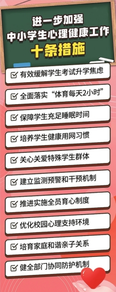 教育部办公厅近日印发《进一步加强中小学生心理健康工作十条措施》(以下简称《措施》),其中包括鼓励每周设置一天“无作业日”,全面落实“体育每天2小时”等。