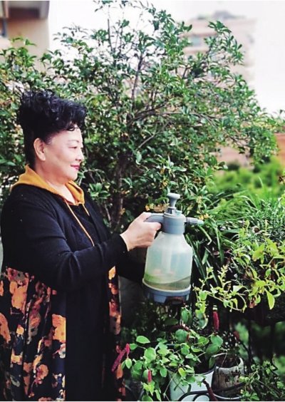 袁佩玉在阳台上给植物浇水。