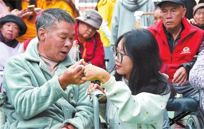 近日,在云南蒙自爱心养老院,志愿者和老人一起做手指操。