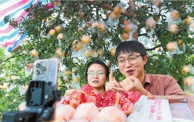 返乡创业大学生吴海涛(右)在果园直播推介蒙自石榴。