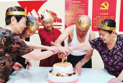 给社区高龄老人过生日。
