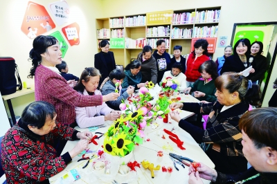 10月28日,长江日报社区行走进江汉区汉兴街道常二社区,重阳节特色活动中,社区居民在共享空间做手工花艺。