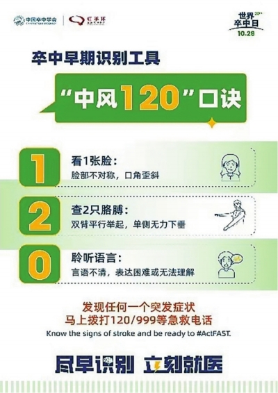 10月29日是重阳节,也是第20个世界卒中日,中国卒中学会发布了2025年世界卒中日中文主题:“尽早识别,立刻就医”。脑卒中俗称“中风”,是一种突然发生的脑血管循环障碍性疾病,主要包括缺血性卒中(俗称“脑梗死”)和出血性卒中(俗称“脑出血”)。
