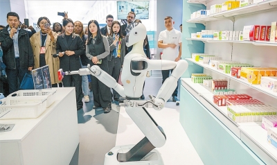 近日,全球妇女峰会嘉宾在观看机器人拿取药品。