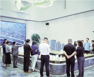 在项目营销中心记者看到,沙盘区围了不少前来咨询的购房人,销售顾问正对着沙盘介绍项目信息,还有销售顾问正脚步匆匆地带着购房人看房,现场一片忙碌。