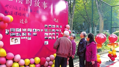 老人在故事照片墙前驻足观看。
