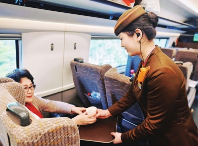 火车上列车员服务旅客。