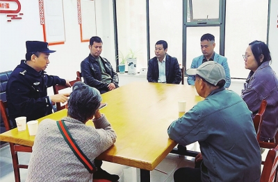 银花社区书记方永恒、辖区民警王建军召开调解会议。