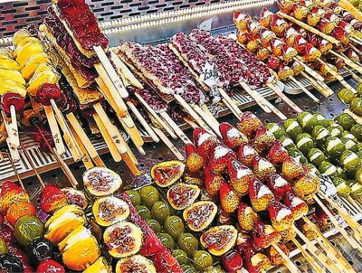 队伍移动的速度十分缓慢。记者观察发现,由于店内售卖的糖葫芦品种繁多,且多为现场制作,出餐效率不高,无形中拉长了顾客的等待时间。橱窗内,刚刚出锅的糖葫芦琳琅满目,早已超越了传统的山楂范式:晴王葡萄冷萃酸奶夹奶皮子、山楂奶皮子、菠萝蜜夹草莓、整根的无花果、草莓花样糖葫芦,甚至还有切糕糖葫芦,创新品种令人眼花缭乱。根据网上团购信息,这些糖葫芦的价格在4元到18.8元不等。