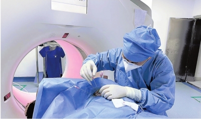 李铭为肿瘤患者实施放射性粒子植入治疗。