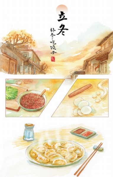 “立冬不端饺子碗,冻掉耳朵没人管。”立冬这天,北方地区有吃饺子的习俗,由于饺子的外形似耳朵,人们会认为吃了饺子,冬天耳朵就不会受冻。此外,立冬也是秋冬季节之交,饺子谐音“交子”,有“更岁交子”之意。