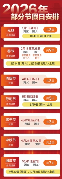 11月4日,国务院办公厅发布关于2026年部分节假日安排的通知。其中,明年春节将从2月15日(农历腊月二十八、周日)至23日(农历正月初七、周一)放假调休,共9天,被称为“史上最长春节假期”。