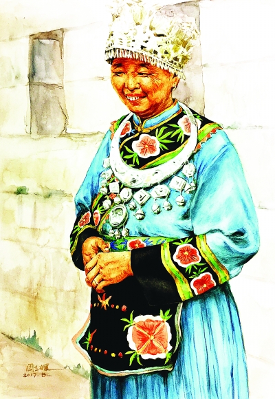 《苗寨阿妈》 水彩画