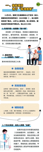 国家卫健委11月4日公布《成人健康体检项目推荐指引(2025年版)》(以下简称《指引》),旨在进一步规范健康体检行为,维护受检者健康权益。根据《指引》,健康体检是指通过医学手段和方法对受检者进行身体检查,了解受检者健康状况、早期发现疾病线索和健康隐患的诊疗行为。