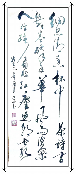 释文:细品清香杯中茶,诗书几卷醉年华。风雨沧桑人生路,看破红尘迎朝霞。
