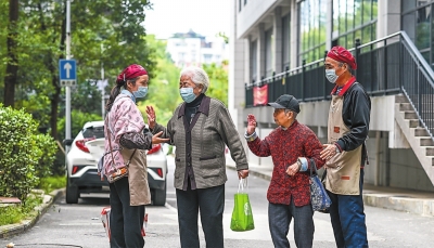 贵阳市南明区社区志愿者给老人上门送餐。