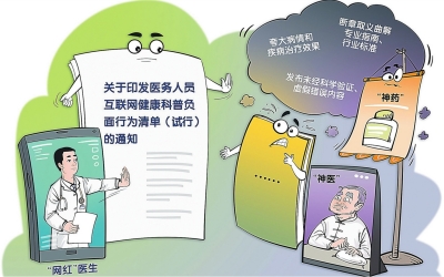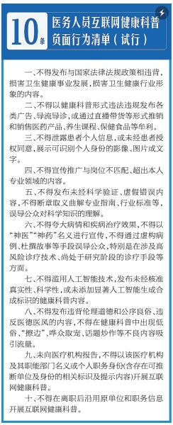 国家卫生健康委等三部门近日发布通知,针对医务人员互联网健康科普行为提出十条负面行为清单。