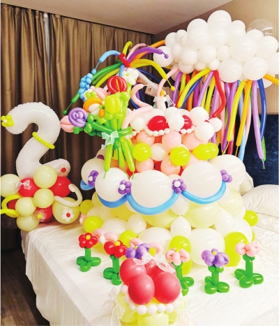 陕钰萱制作的气球蛋糕、花束、烟花等造型。
