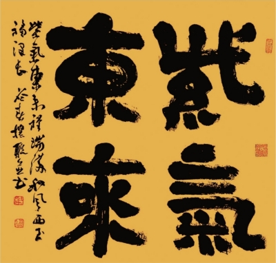 款识:紫气东来祥瑞满;和风西至福泽长。谷春撰联并书。