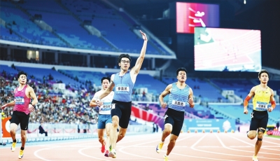 男子100米决赛中,前程落后的李泽洋在最后时刻完成反超。山东队王胜杰和广西队曾克理分别获得银牌、铜牌。
