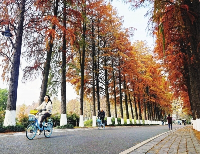 12月2日,在武汉东湖绿道看到这里的水杉变色,远远看去如同红雾一般。人们骑行在绿道上,欣赏沿途美景,心情得到舒缓,感受到东湖绿道不同以往的冬日美景。