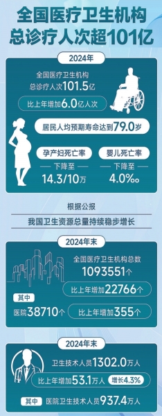 国家卫生健康委2日发布的《2024年我国卫生健康事业发展统计公报》(以下简称《公报》)显示,2024年,全国医疗卫生机构总诊疗人次101.5亿,比上年增加6.0亿人次,居民人均预期寿命达到79.0岁,孕产妇死亡率下降至14.3/10万,婴儿死亡率下降至4.0‰。