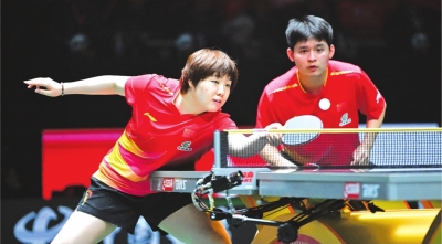 1日,中国队组合蒯曼(左)/林诗栋在混双比赛中。他们3比0战胜埃及队组合巴德尔·穆斯塔法/玛尔娃·阿尔霍达比。