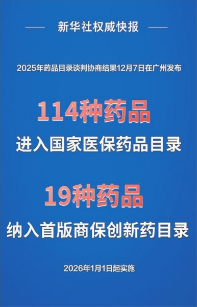 新版目录将于2026年1月1日在全国范围内正式实施。随着更多新药进入目录,临床用药水平将得到稳步提升,有效提振医药行业加大研发创新的信心,为人民群众的健康提供更多保障。下一步,国家医保局等部门将进一步细化政策、加强管理,切实做好目录落地。