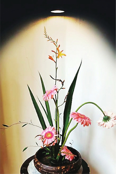 当然,如果我有两朵花,我会用其中一朵来插花。说到插花,个人认为并不需要刻意准备,因为,花一直都在那里。生活中,连厨房的菜蔬都可以插花,何况人生何处无芳草?近几年,经常和朋友们一起参加读书活动,遇到插花老师便会诚恳讨教,遇到同道中人也会认真学习。大多时候,自己就地取材,无论刚得的鲜切花枝或遗落的枯枝残叶,都会用心设计,好好创造。在插花的过程中,既要尊重一花一品,各姿各态,又要注重整体和谐,意趣盎然。如作品“此焰彼火”,非洲菊如特写的大烟花,而火焰兰则是零星绽放的小焰火,它代表某种敬畏的心情。世界有大光明,也有小萤火,温暖他人或照亮自己,都是一种勇气和善意。