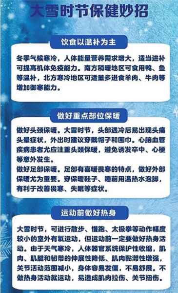 古籍《月令七十二候集解》说大雪“万物收藏”,大自然都开始休养生息,人也得跟着“藏能量”,为春天攒力气。