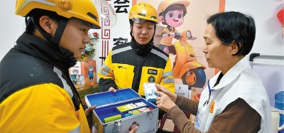 北京东城区崇文门外街道“崇外e家”的工作人员为外卖配送员提供应急药品。