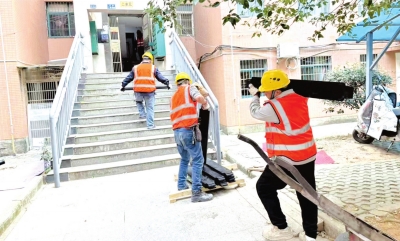 小区电梯更新工程现场,工人正忙着开工。
