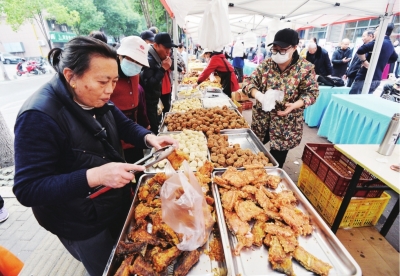 农副产品展销区物美价廉,陈英迪食品现场炸圆子,香气扑鼻,引来居民排队购买。