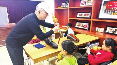 杨才礼在社区邻里学堂教孩子们吹葫芦丝。
