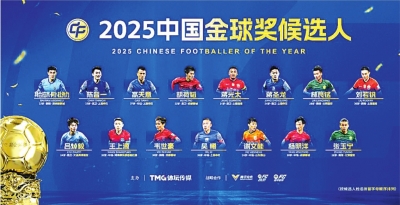 新华社北京12月15日电 在综合考量全年全系列足球赛事的表现后,2025中国金球奖候选名单15日揭晓,吴曦、张玉宁、蒋光太、韦世豪、林良铭等15名球员在列。